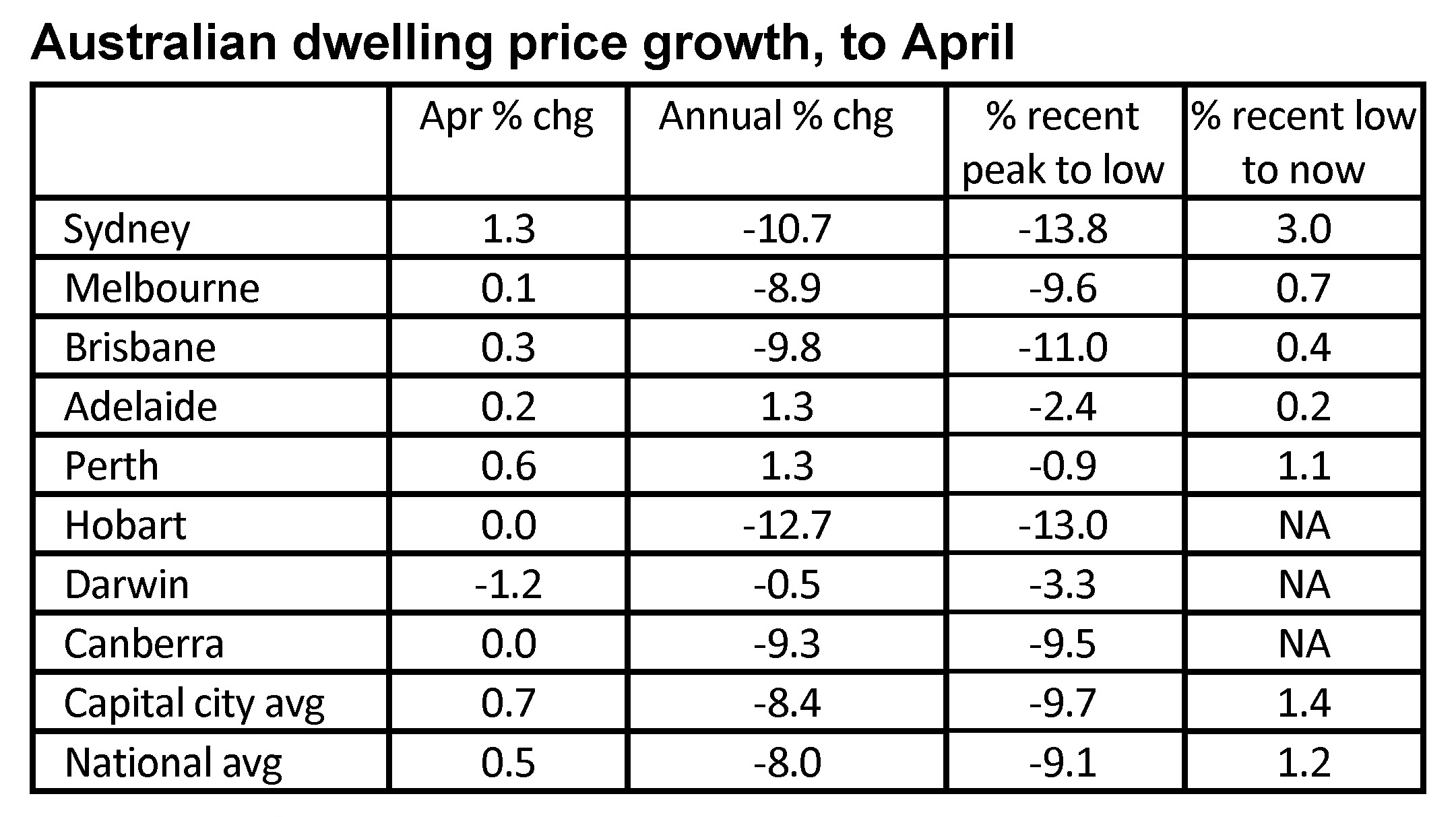 Home prices up again in AprilYet again the Australian residential property market is surprising with its resilience and defying forecasts for sharp falls. After falling 9.1% from their high in April last year to their low in February, national average home prices rose another 0.5% in April after a 0.6% gain in March and are up by 1.2% from their February low. Sydney has led the charge with a 1.3% rise in April and is up 3% since January.