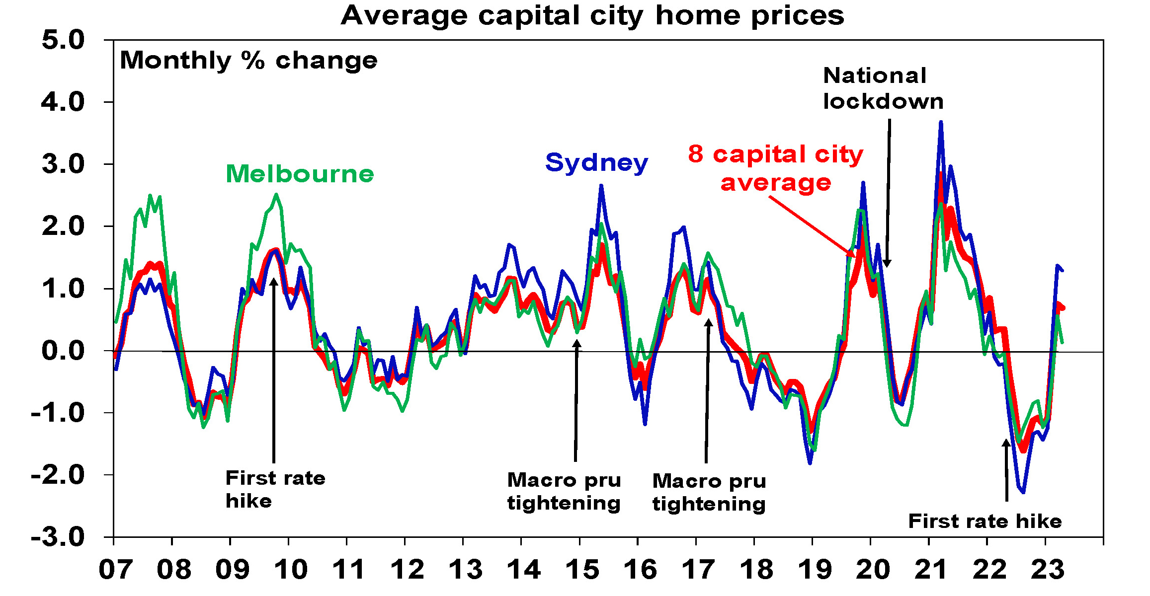 Outlook – revising up our home price forecastsThe combination of surging underlying demand driven by immigration, tight supply, low listings and home buyers motivated by expectations rates may be peaking & the historical record showing prices rebounding quickly after falls, tight rental markets and a fear of missing out appear to be dominating the drag from high interest rates and the slowdown in the economy. As such, our forecast for a top to bottom fall of 15-20% out to late this year is looking too pessimistic and we have revised our national average home price forecast for this year from a fall of 7% to flat to up slightly & expect roughly 5% growth next year. This assumes the RBA cuts rates through next year and the economy has a soft landing.
