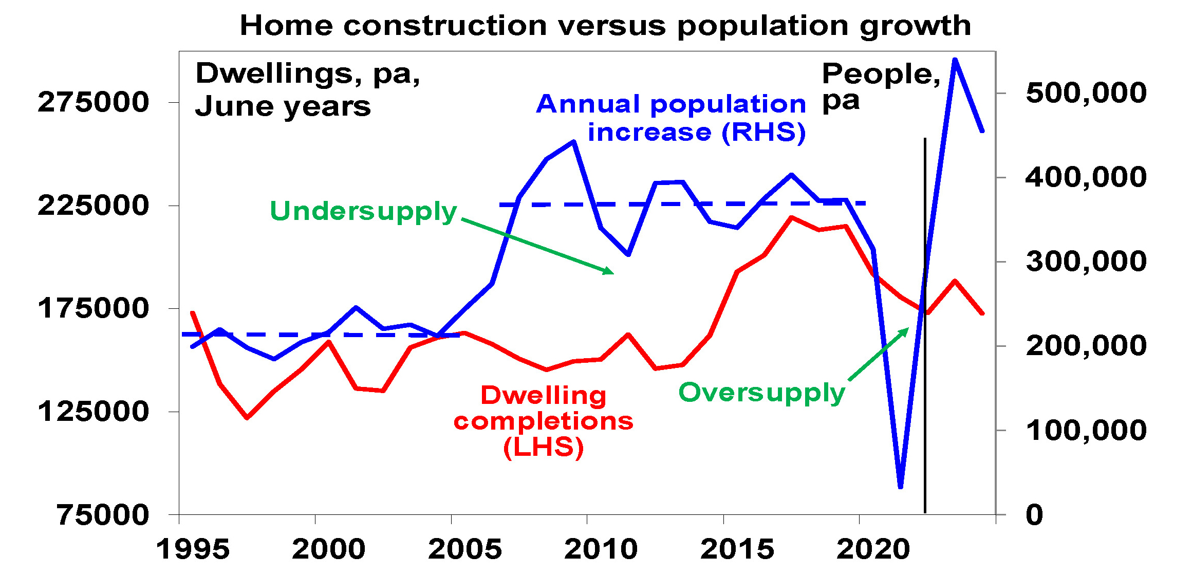 - This has occurred against the background of a decline in average household size to less than 2.5 people per dwelling through the pandemic, which the RBA estimates has added around 120,000 households to underlying dwelling demand. This largely offset the negative impact on demand from the hit to immigration through the pandemic lockdown. It could reverse again with rising housing costs but so far this is unknown.