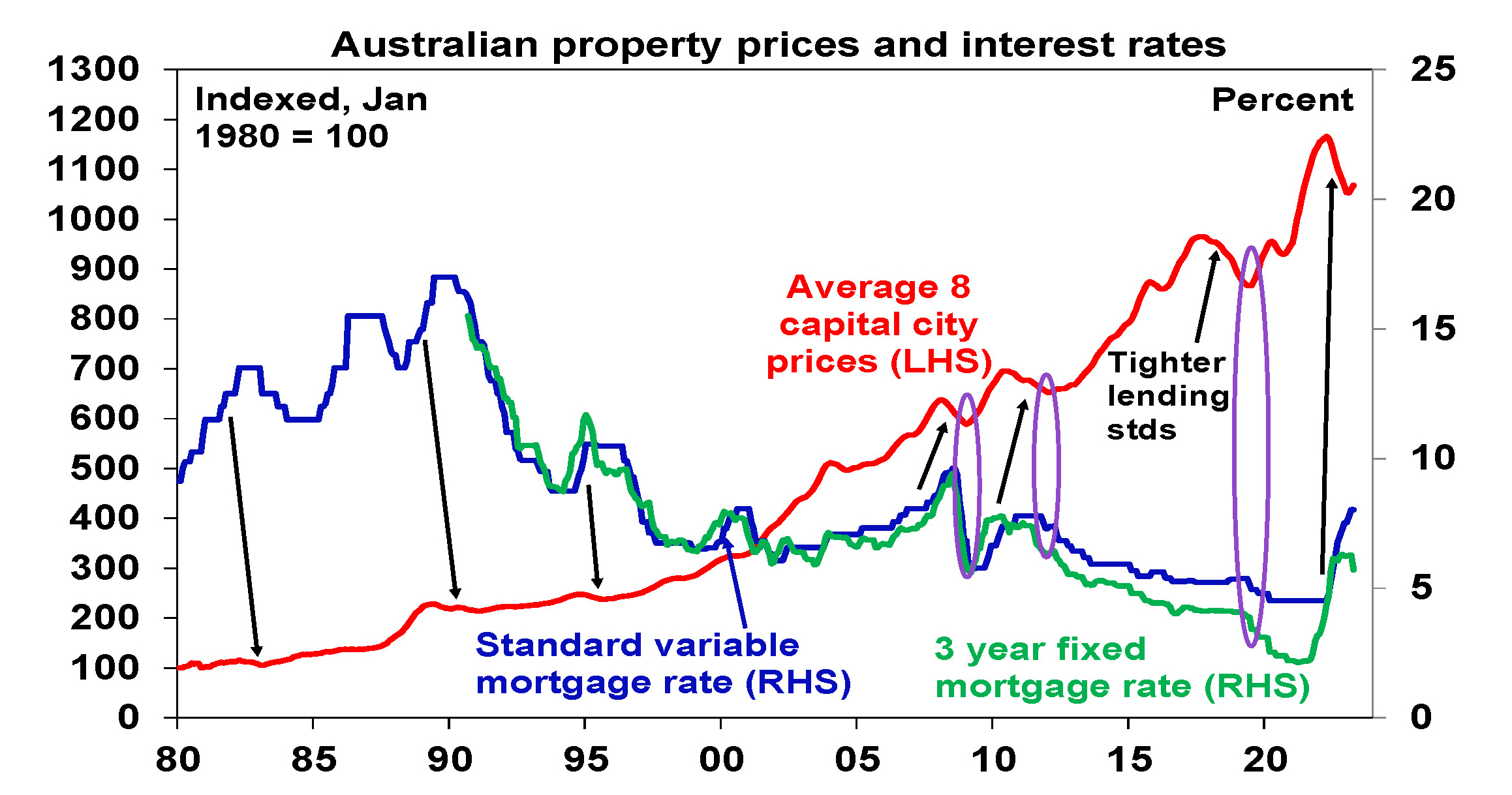 - The first point to note is that this property cycle has been a bit unusual. Normally it’s taken several interest rate hikes to knock property prices down because it takes time to cool demand, for unemployment to rise and for distressed sales to increase. However, in this cycle property prices started to fall immediately when rates started to go up and at a time when the underlying property demand/supply situation was tightening. And the last three property price upswings (from 2009, 2012 and 2019) required an easing in monetary policy to get underway (see the ovals in the next chart).