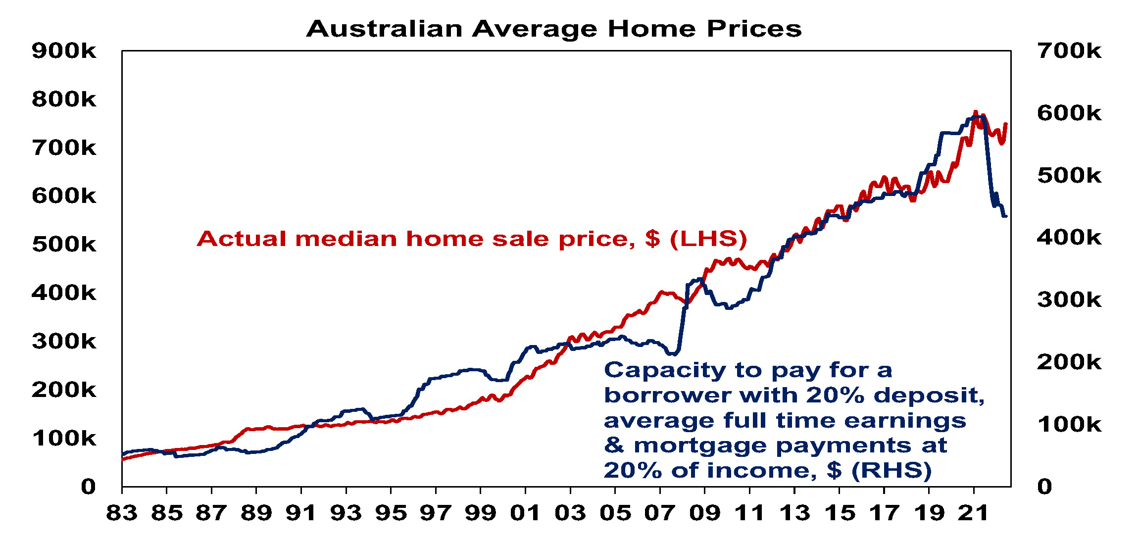 - The hit to home buying capacity from rate hikes - of 27% for a buyer with a 20% deposit and average full-time earnings - remains, even if rates have stopped rising. See the next chart. There was a divergence versus prices in 2003-2008 when buyer capacity fell as rates rose but prices rose due to a surge in demand from high immigration levels associated with the mining boom with the divergence ultimately eliminated with the rapid rate cuts in the GFC. This time around we are seeing a similar supply shortfall, but rapid rate cuts are unlikely. So, this is likely to remain on ongoing constraint on buyer demand.