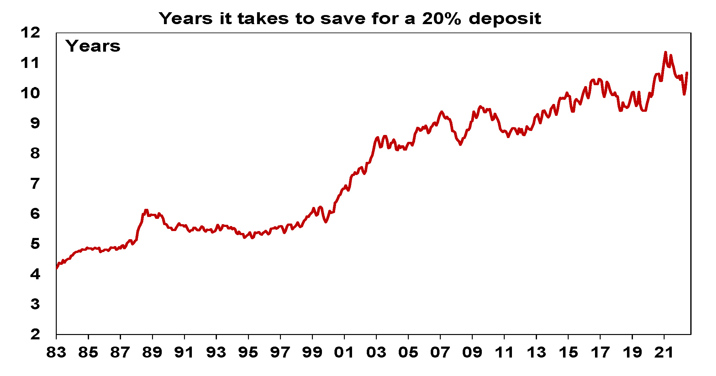 - All measures of housing affordability are poor. Despite the fall in prices from their highs it takes over 10 years for someone on average full-time earnings to save for a deposit, versus 5 years 30 years ago.