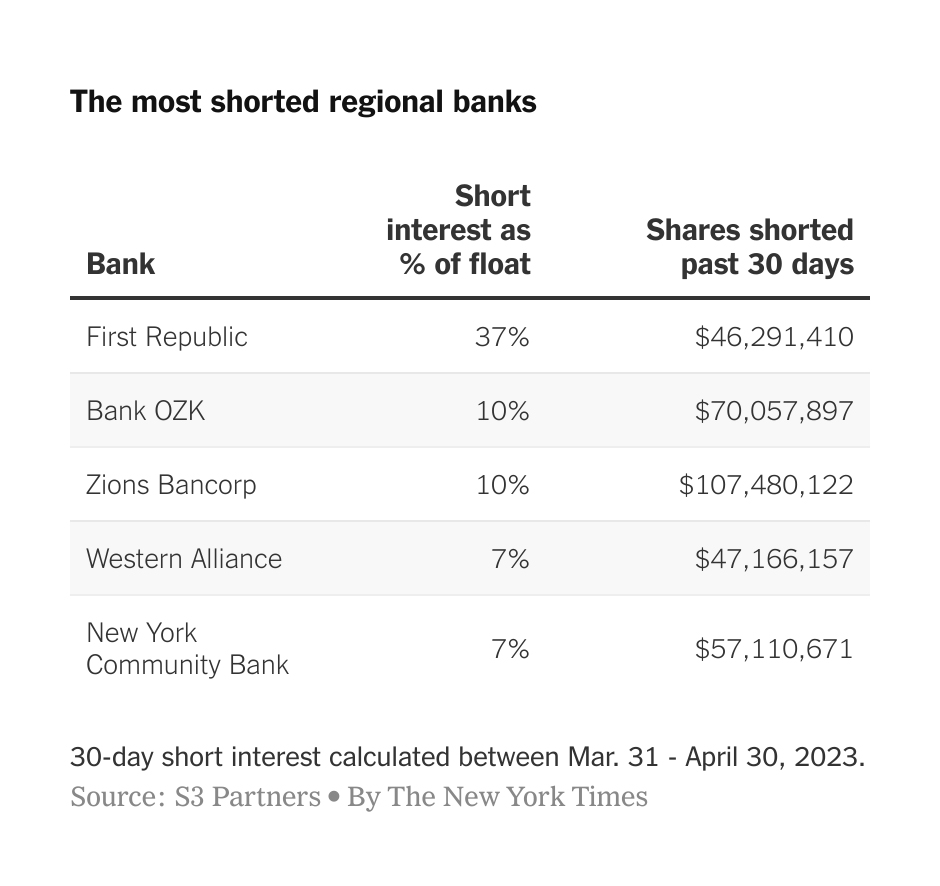 And short sellers are looming large - Hedge funds that bet stocks will fall scored a mammoth return on First Republic’s demise. By last Friday, over a third of the bank’s shares were held by short sellers. And it looks like other targets are in their sights.