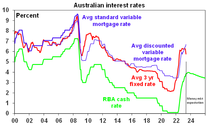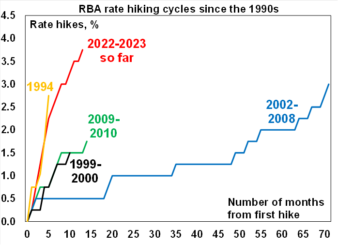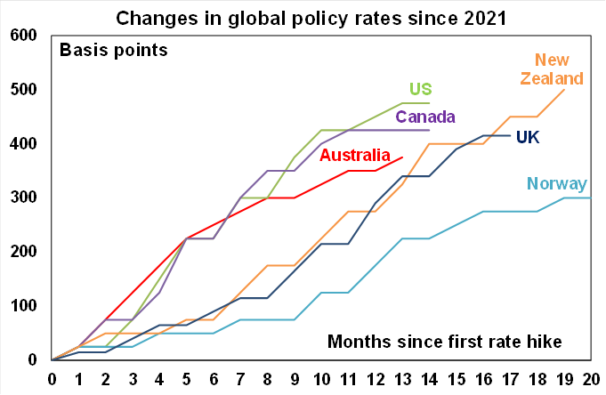In hiking the cash rate by another 0.25% the RBA noted that while inflation has peaked, it’s still too high and is not expected to return to the top of the target range until mid-2025, services price inflation is still very high, the labour market remains very tight with rising unit labour costs and subdued productivity and there are upside risks to wages growth.
