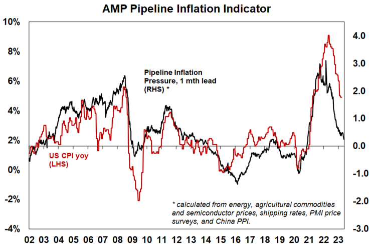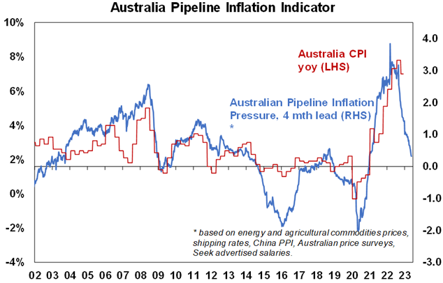 The good news though is that our US Pipeline Inflation Indicator is continuing to fall pointing to a further fall in US inflation ahead. This will ultimately support central bank rate cuts and share markets are a 12-month view.