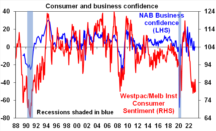 Consumer confidence back to its lows. Highlighting the soft economic outlook consumer confidence fell back to around its lows this month reflecting the latest RBA rate hike and not helped by the absence of handouts for most Australians in the Budget. It continues to remain well below business confidence and warns of softer conditions ahead as the reopening boost and pent up demand wears off.
