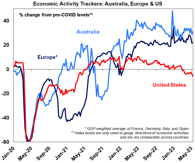 Levels are not really comparable across countries. Based on weekly data for eg job ads, restaurant bookings, confidence, credit & debit card transactions and hotel bookings. Source: AMP