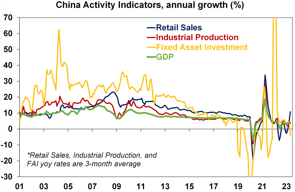 China’s recovery looks to be losing some momentum. Chinese economic activity data for April was softer than expected. Retail sales growth accelerated to 18.4%yoy but this was due to base affects associated with lockdowns a year ago with sales actually down 7.8% in April. Industrial production growth rose but by less than expected and investment growth slowed. While residential property sales are turning up and home prices are continuing to rise, residential investment remains weak. Unemployment was little changed at 5.2% but youth unemployment rose to a new record high of 20.4%. Overall, it appears momentum from the reopening may have faded quicker than in other countries (partly due to less support for the household sector and so less pent up saving) and further policy easing may be required.