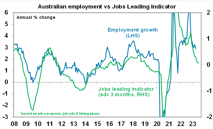 Forward looking indicators for the jobs market point to a slowdown. This is evident in our Jobs Leading Indicator which is based on job vacancies, job ads and business hiring plans.