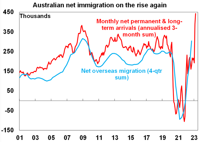 Surging immigration to cool the jobs market but heat up the property market. Monthly net permanent and long term arrivals data to Australia up to March has now pushed above an annualised 400,000 pointing to a continuing surge in Australia’s population. This has pushed working age population growth up to 2.4%yoy (from 1.6%yoy pre pandemic) and will help fill job vacancies and cool the jobs market. But it will also add to the already tight housing market continuing upwards pressure on rents and (mostly indirectly) home prices.