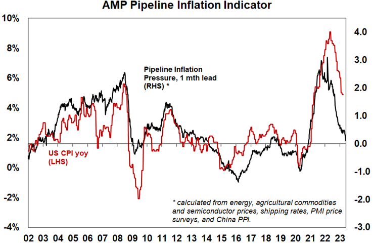 Overall, our assessment remains that central banks are at or near the top on rates as inflation pressures are likely to continue to ease - our US Pipeline Inflation Indicator fell further in the last week reflecting declines in PMI price surveys. This also applies to Australia where soft data, as seen in April retail sales, provides room for the RBA to leave rates on hold at its June meeting. This is our base case but continuing hawkish commentary from the RBA along with risks around wages (watch the June minimum wage decision), productivity and rising home prices (which are reversing the negative wealth effect) mean that the risk of further RBA rate hikes is high. The problem is that we are now seeing clear evidence that rate hikes are slowing the economy – with falling real retail sales, falling building approvals, slowing business investment plans and early indications of a slowing jobs market. At the same time inflation is off its highs and heading down. With the lagged effect of past rate hikes yet to impact there is a high and rising danger that the RBA will end up going too far by focussing too much on unemployment, inflation and wages growth which are lagging indicators of what the economy is doing.