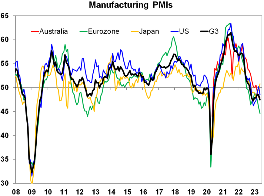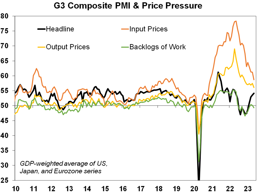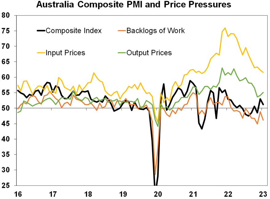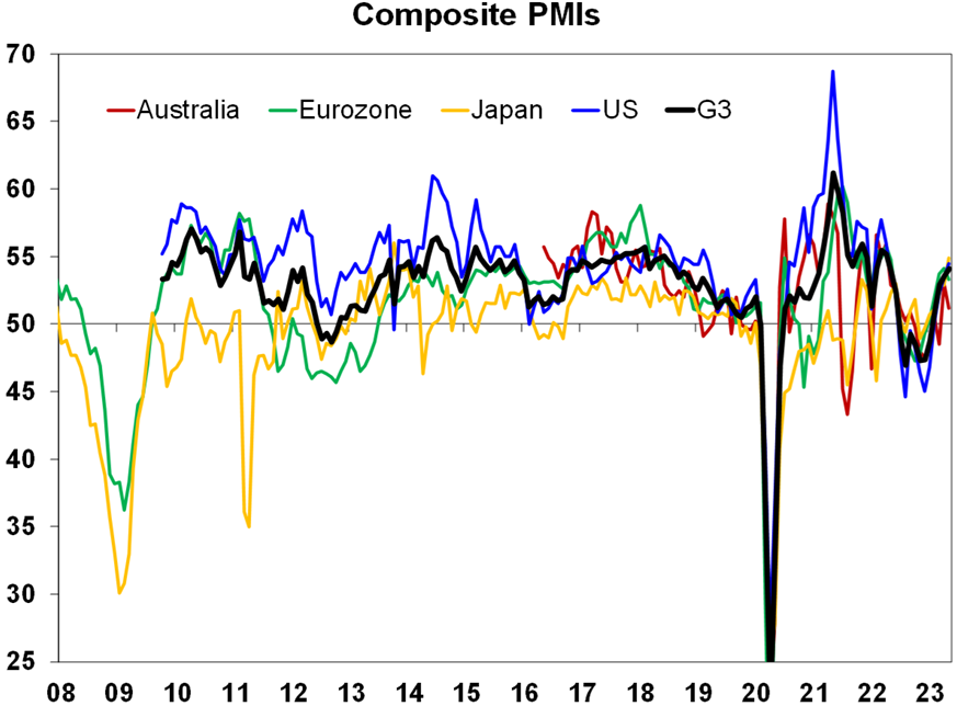 Australian economic events and implicationsAustralian business conditions PMIs for May fell but to a still ok level and as is the case globally are seeing solid services but soft manufacturing. Price pressures are generally continuing to improve with input prices down again, output prices up but well down from their highs and order backlogs continuing to improve. All of which remains consistent with easing inflation pressures.