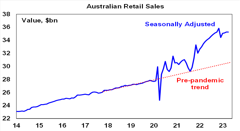 Retail sales were flat in April as rate hikes impact. While retail sales are still way above their pre-covid trend this is now distorted by the rapid price rises of the last 18 months and more importantly nominal retail sales are basically unchanged since September, which means they have been falling real terms. Clothing and department stores were the only categories that gained in April but this likely reflected colder than normal weather. Consumers are curtailing their spending on discretionary goods as part of the rotation back to services with reopening but also increasingly as a result of rate hikes and cost of living pressures. This is a key indicator that the RBA looks at and is firmly in the camp supporting the RBA leaving rates on hold in June.