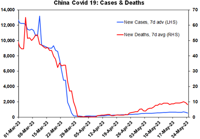 In Australia, the focus is likely to be on the monthly CPI Indicator (Wednesday) for April, where we expect a further fall to 6.2%yoy from 6.3%yoy in March, providing further confirmation that we have seen the peak in inflation at 8.4%yoy in December. In terms of other data, expect a 2% gain in building approvals (Tuesday), a stabilisation in housing credit growth as is starting to become apparent in housing finance but a 1.5% fall in March quarter construction data (both Wednesday), a 1% rise in March quarter business investment (Thursday) which is also likely to show some slowing in investment plans and housing finance (Friday) to rise 1%. CoreLogic data for May is likely to show a further acceleration in home price gains to 1.4%mom, making it three months of gains in a row, with Sydney leading the charge with a 1.7%mom rise.