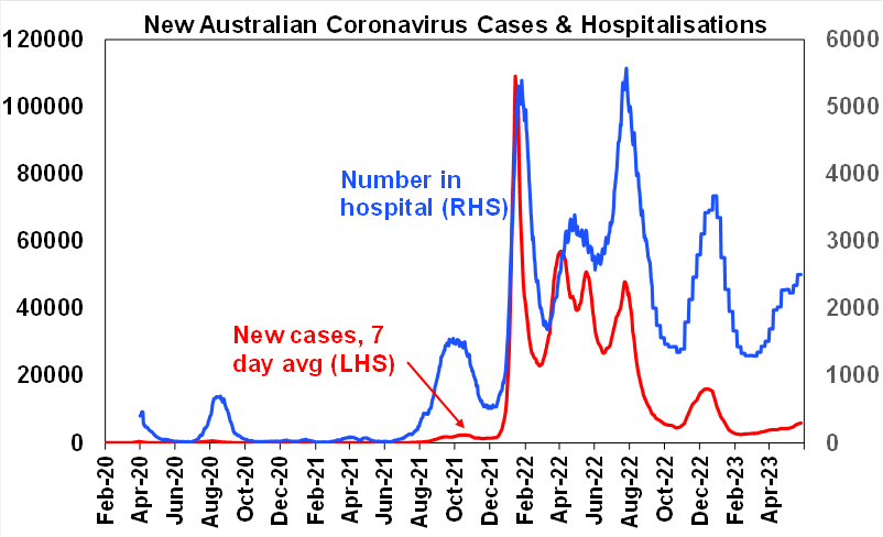 Although global and Australian shares could have a short term bounce if there is a resolution to the US debt ceiling, they continue to look vulnerable over the next few months. Share market gains since the lows last year have been more narrowly based and defensive than would normally be seen this far into a recovery. US debt ceiling brinkmanship and its aftermath could continue to create volatility ahead. Banking stress is continuing in fits and starts in the US resulting in additional monetary tightening. Leading economic indicators continue to point to a high risk of recession in the US and Australia. China’s recovery is looking less robust. The weakness in copper, oil and other industrial commodities suggests weakening demand and this is also being reflected in the growth sensitive Australian dollar. Central banks are probably close to the top but risk doing more. And the period from May to September is often rough for shares. We remain of the view that shares will do okay on a 12-month view as central banks ease up as inflation cools but the next few months are likely to be rough.