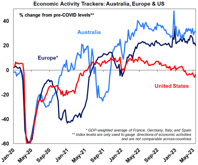 Economic activity trackersOur Economic Activity Trackers rose slightly in Australia and the US in the last week, but fell in Europe. Overall, they are suggesting flat to only slightly positive economic growth year to date in Australia and Europe, but possibly an emerging contraction in the US.