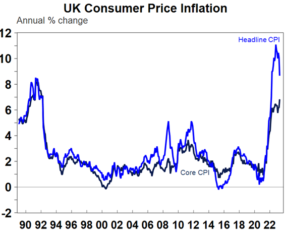 The message from central banks over the last week was mixed: the Bank of England looks certain to hike more given higher than expected UK inflation which may partly be due to Brexit; RBA Governor Lowe repeated his hawkish message to federal MPs warning of more hikes ahead in a reportedly “pretty pessimistic” briefing; the Fed looks unclear as to whether it will do more or not but does appear to be leaning to a pause next month; the Bank of Korea and the central Bank of Indonesia left rates on hold; and the RBNZ after another hike signalled rates had likely peaked ahead of rate cuts in the September quarter next year.