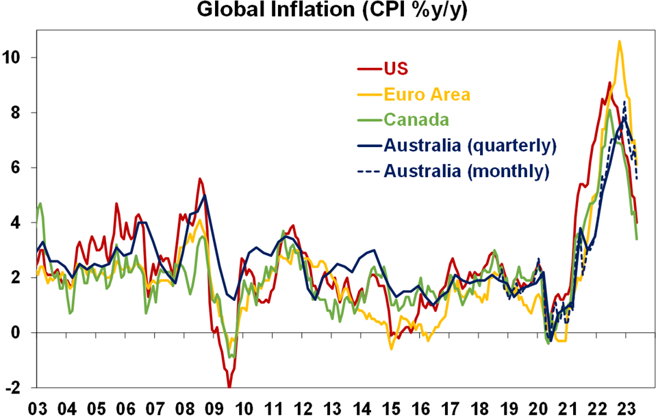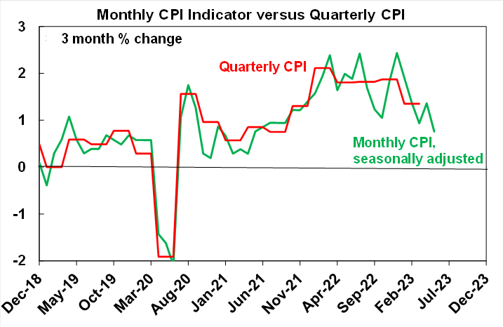 The Australian Monthly CPI Indicator fell to 5.6%yoy its lowest since April last year confirming the downtrend from the 8.4%yoy high in December. There is now a clear downtrend evident in the rates of inflation for clothing (where prices are actually falling), new dwelling costs, furnishings, and holiday travel. In fact the 3 month rate of change in the seasonally adjusted monthly CPI has now slowed to 0.8% (or 3% annualised). The downtrend in the Monthly Inflation Indicator provides some confidence that Australia’s inflation profile is following that of Canada (where inflation has fallen to 3.4%yoy) rather than the UK (where inflation is still 7.9%yoy). Against this though the Monthly CPI Indicator is notoriously volatile (which questions whether its compilation is a good use of public money in the first place), pressure remains on services inflation with eg meals out and takeaway foods, rents and insurance inflation still accelerating and a sharp rise ahead in gas and electricity prices and underlying measures of inflation remain above 6% - particularly once fruit & vegetables, petrol and holiday travel are excluded.