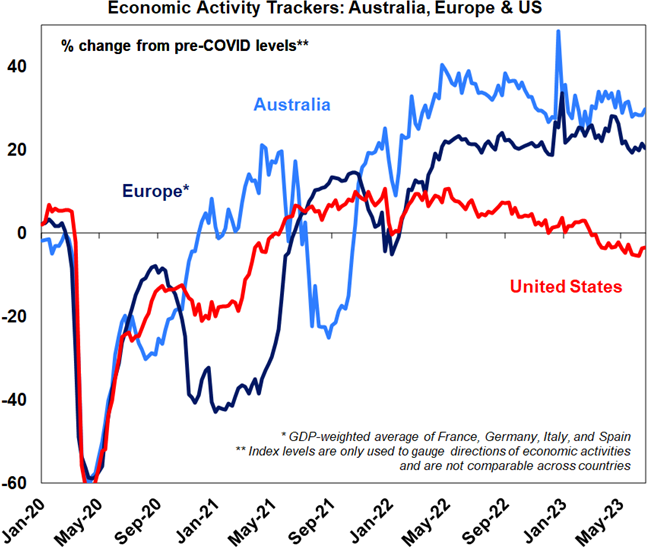 Economic activity trackersOur Economic Activity Trackers rose in Australia and the US over the last week but fell slightly in Europe. They continue to indicate a clear slowdown in the US but just a loss of momentum in Australia and Europe.