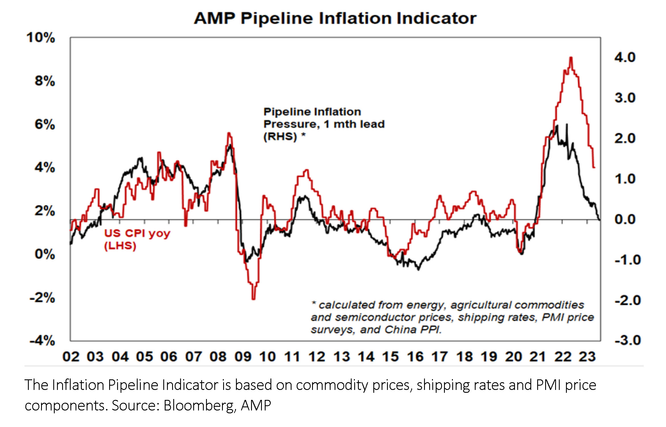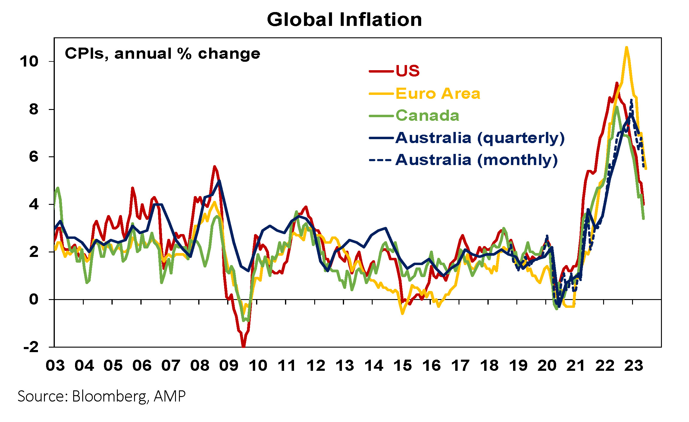 - While inflation rose to its highest in decades in 2022, it peaked in the US a year ago and has been trending down since with other countries following suit. Australia, which lagged on the way up, is doing the same on the way down. This reflects improved goods supply, lower commodity prices, lower transport costs and easing demand.
