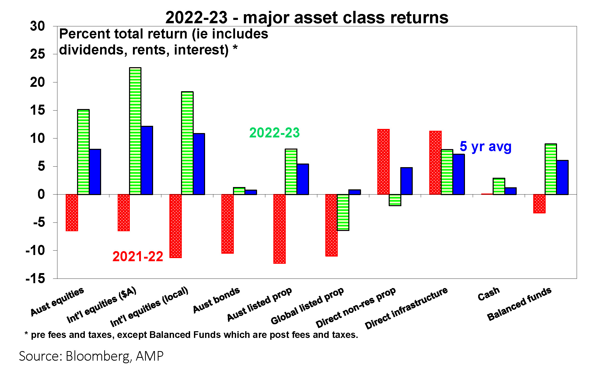 Global shares returned 18% in local currency terms over 2022-23, with a fall in the $A (with lower commodity prices) boosting this to 23% in $A terms. Japanese & Eurozone shares outperformed, US shares benefitted from a rebound in tech stocks (helped by AI) & Chinese shares fell.