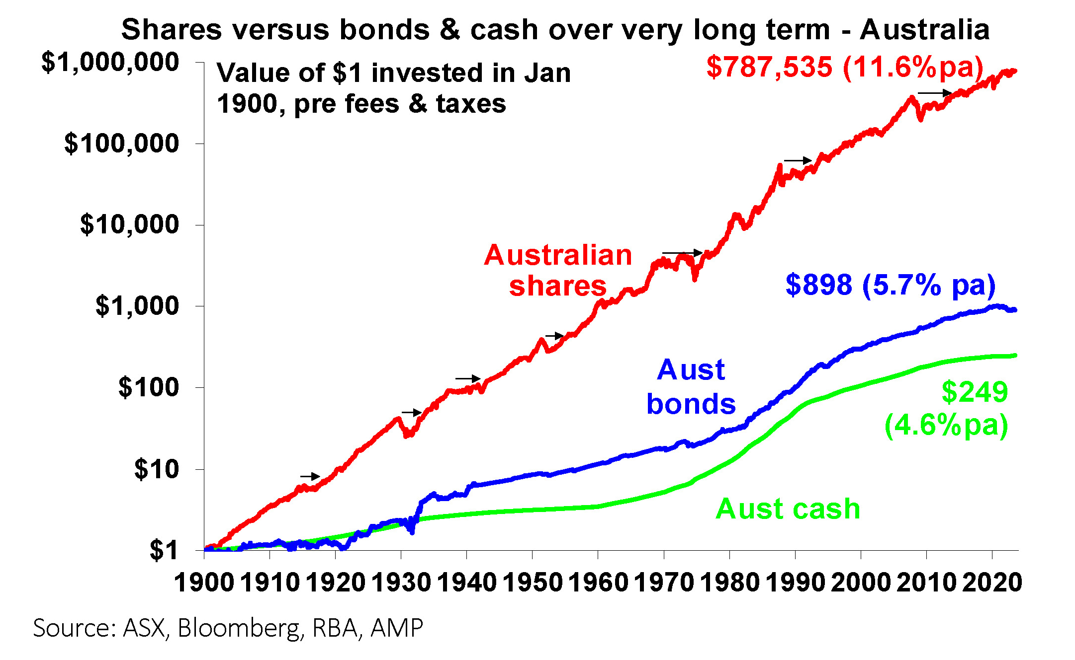 9. Start saving and investing earlyIf you want to build your wealth to get a deposit for a house or save for retirement the best way to do that is to take advantage of compound interest – where returns build on returns. Obviously, this works best with assets that provide high returns on average over long periods. But to make the most of it you have to start as early as possible. Which is why those piggy banks that banks periodically hand out to children have such merit in getting us into the habit of saving early. This gives me another opportunity to show my favourite chart on investing which tracks the value of $1 invested in Australian shares, bonds and cash since 1900 with dividends and interest reinvested along the way. Cash is safe but has low returns and that $1 will have only grown to $249. Shares are volatile (and so have rough periods highlighted by arrows) but if you can look through that they will grow your wealth and that $1 will have grown to $787,535.