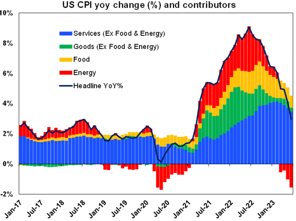 US inflation falling as fast as it went up will take pressure off the Fed. US inflation surprised on the downside again in June falling to 3%yoy, which is down from 9.1% a year ago. Core inflation fell to 4.8%yoy. This was helped by base effects as high monthly increases a year ago drop out but the monthly pace of inflation has also slowed with 3 month annualised core inflation slowing to 4.1%. Just as goods price inflation led services inflation on the way up its also leading on the way down with services inflation now slowing.