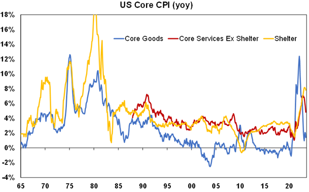 In fact, the core services inflation excluding shelter which the Fed has been focussing on has slowed to 2.4% annualised in the last 3 months and shelter inflation is now also rolling over consistent with falling inflation in asking rents. Technical measures of underlying inflation such as the median and trimmed mean inflation are also rolling over and the breadth of price rises is now collapsing with only 45% of CPI categories now seeing monthly annualised inflation greater than 3%.