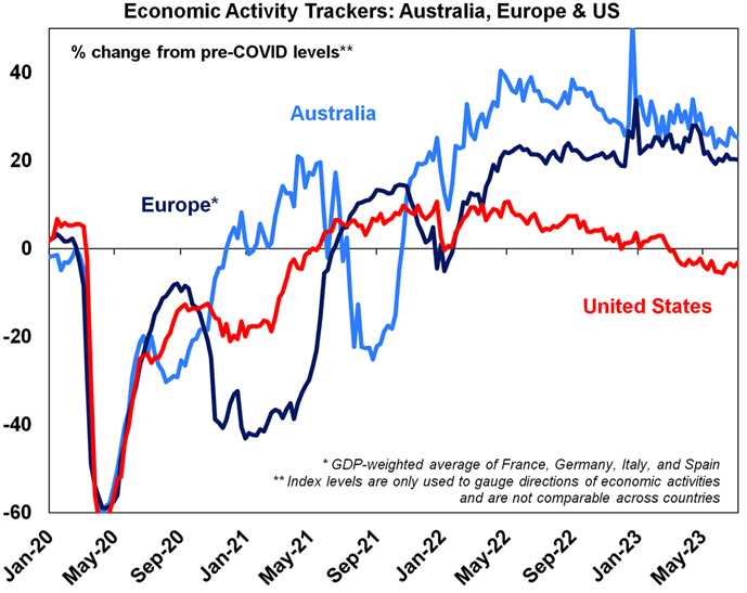 Economic activity trackersOur Economic Activity Trackers ticked down in Europe and Australia in the last week but rose in the US. They are yet to indicate any significant fall in economic activity though.