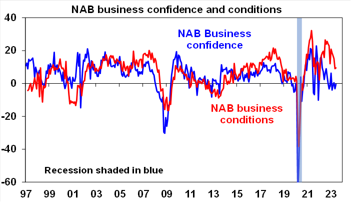 Australian economic events and implicationsAustralian consumer confidence remains very weak, but business conditions remain resilient so far. According to the July Westpac/Melbourne Institute consumer survey, consumer confidence rose 2.7% possibly helped by news of lower inflation and the RBA’s decision to leave rates on hold. However, the alternative ANZ/Roy Morgan consumer sentiment survey shows a fall since the RBA meeting and in any case measures of consumer confidence remain around recessionary levels.