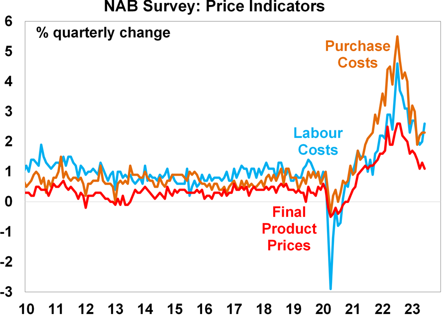 The NAB survey also showed that while price and cost pressures are well down from their highs, they are still elevated with a rise in labour costs -possibly reflecting the late May announcement of faster award and minimum pay rises this year.