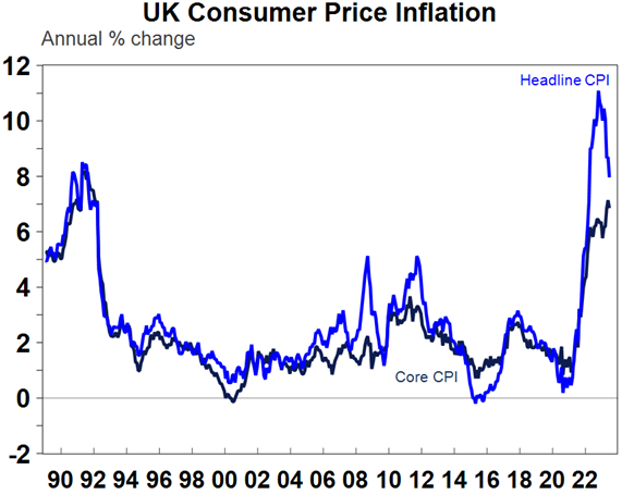 UK inflation fell to 7.9%yoy from 8.7% with core inflation falling to 6.9% from 7.1%.