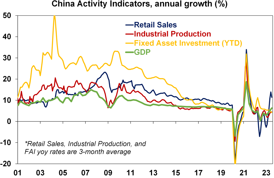Chinese economic data for the June quarter was a mixed bag adding to concerns about the strength of its post covid economic rebound. GDP growth slowed to 0.8%qoq with annual growth coming in weaker than expected at 6.3%yoy when the consensus was expecting a 7.1%yoy rise from the lockdown depressed activity a year ago. Growth in industrial production and investment beat expectations but retail sales slowed more than expected to just 3.1%yoy (note that the chart below is smoothed), property sales and investment were weak and youth unemployment continued to trend up beyond 20%. Further stimulus is likely and has been promised but so far it has disappointed.