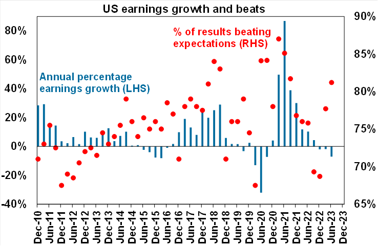 US earnings continue to come in better than expected. Around 50% of S&P 500 companies have now reported with 81% beating earnings expectations (compared to the norm of 76%) with an average beat of 6%. Consensus earnings expectations for a 7% decline in earnings over the year to the June quarter still look too pessimistic.