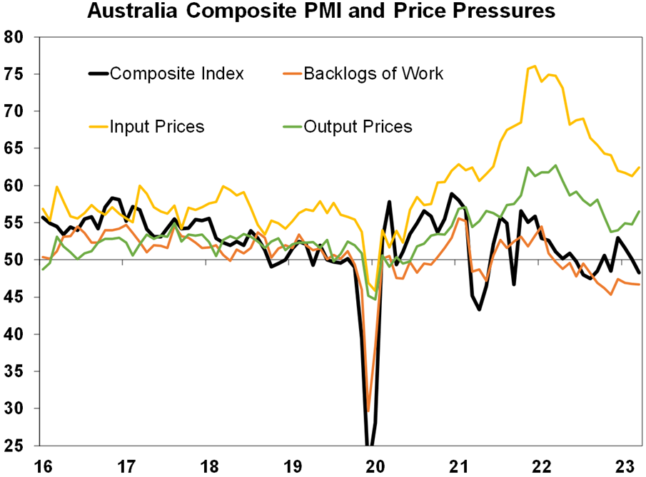 Australian economic events and implicationsAustralian business conditions PMIs for July fell again taking the composite index back below the 50 growth/contraction level with a sharp fall in services conditions. Price and cost pressures remain well down from their highs, but both have edged up lately from elevated levels with faster wages growth possibly impacting in terms of services. This is similar to what the NAB business survey has been reporting. Order backlogs are continuing to improve though.