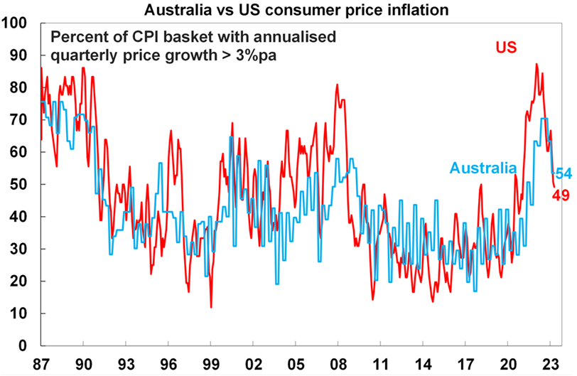 Underlying measures of Australian inflation have also fallen with the trimmed mean at 5.9%yoy (down from a peak of 6.9%yoy) and the breadth of price gains has narrowed with now only 54% of CPI components seeing an annualised gain of 3% or more down from a peak of around 70%.
