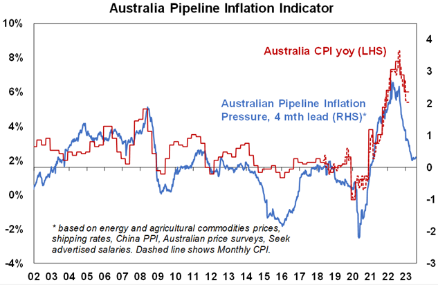 - Inflation is actually falling slightly faster than the RBA is forecasting, our Australian Pipeline Inflation Indicator points to further falls ahead and there is a good chance that it will be at 3% by mid next year, 12 months ahead of RBA expectations. This should provide time for the RBA to “wait and see”.