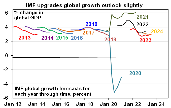 IMF upgrades the global growth outlook slightly. Reflecting the relative resilience in global growth this year the IMF revised up its 2023 global growth forecast to 3% and continues to see 3% next year. This is still slower than last year’s 3.5% thanks to a slowdown in advanced countries but emerging countries growth is being stabilised by the recovery in China (even though its slower than hoped). 3% growth is similar to what was achieved in much of the 2012-19 period.