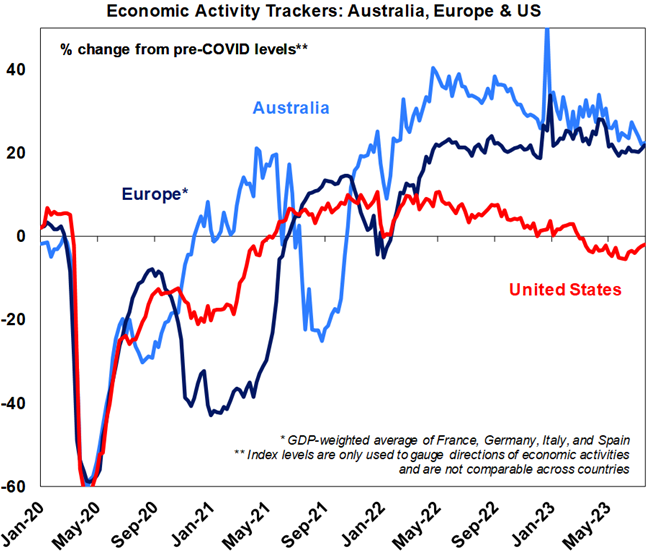 Economic activity trackersOur Economic Activity Trackers are trending up in the US consistent with better economic data lately, flat to up slightly in Europe and down in Australia.
