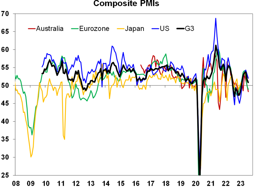 Major global economic events and implicationsJuly business conditions PMIs were stable in Japan but fell again in the US, Europe and UK with manufacturing conditions, Europe and Australia in negative territory. Their rebound since late last year looks to be over as rate hikes continue to bear down on economic activity.