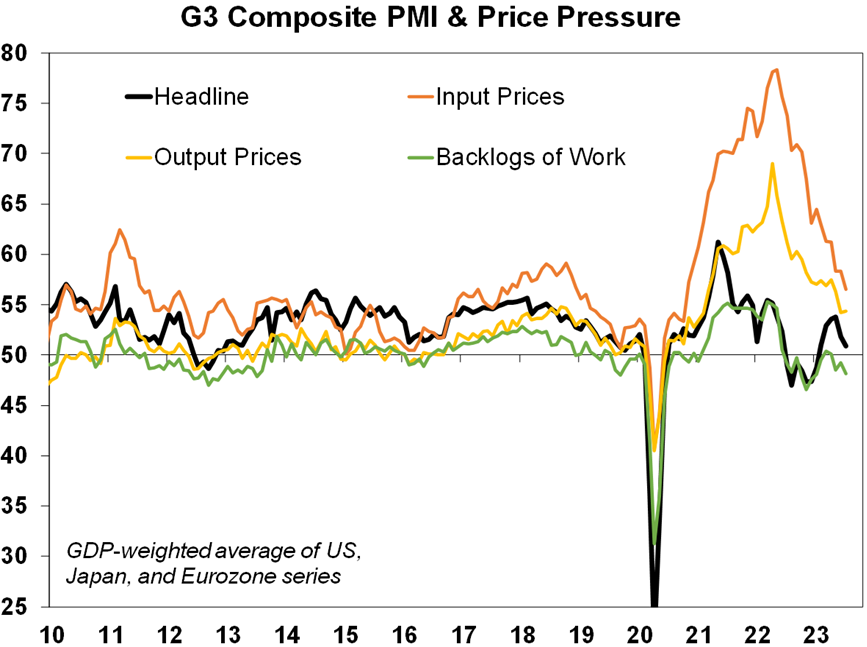 Meanwhile the PMI’s show a continuing downtrend in input and output price measures, order backlogs well down from their 2021-22 highs and delivery times remaining much improved which is all consistent with an ongoing easing in inflationary pressures.