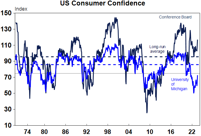 Other US data was mostly solid. June quarter GDP growth was a faster than expected 2.4% annualised with solid consumer spending and capex confirming that the US economy is continuing to grow. Underlying capital goods orders saw modest growth. Jobless claims fell. The Conference Board’s measure of consumer confidence rose sharply in July taking it well above average, in contrast to the University of Michigan confidence index which is up but remains well below its long run average. Home prices also continued to bounce back in May, but new home sales and new mortgage applications fell with the latter remaining very weak.