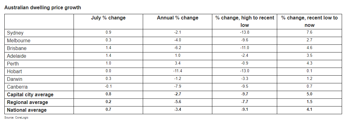 Home price gains slowing down againCoreLogic national average home price data shows a 4.1% rise from their February low, but the rate of growth slowed again in July to 0.7%, led by a slowing in Sydney, with price gains accelerating in Brisbane and Adelaide and strong in Perth but soft in other capitals and regional areas with Canberra seeing prices fall.
