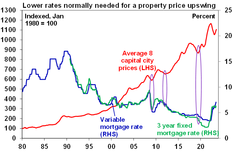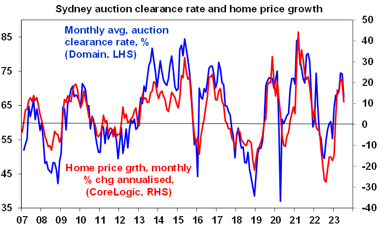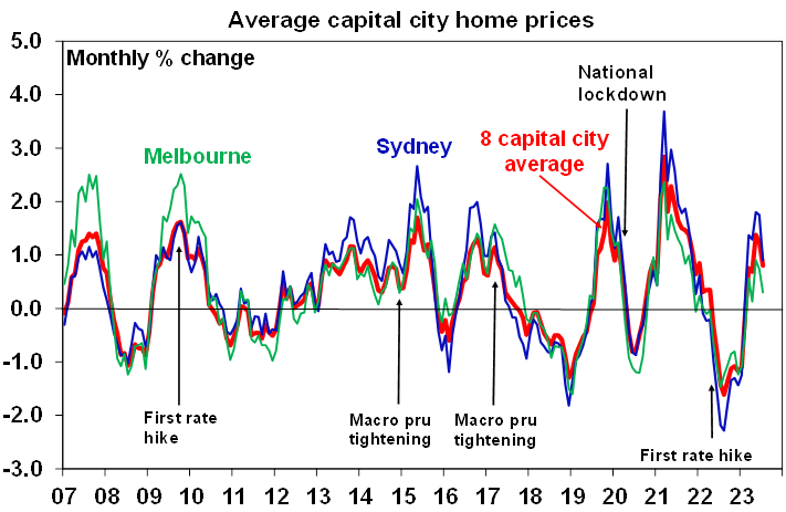 The fundamental supply shortfall offset rate hikes over the last few monthsThe rebound in prices since February this year reflects a worsening shortfall of supply relative to underlying demand for homes. Immigration has surged and is likely to exceed 400,000 this year driving the fastest population growth in 15 years at the same time that the supply of new dwellings is slowing. This in turn accentuated very tight rental markets, forcing rents up and driving renters to consider buying earlier than they otherwise would have. At the same time foreign demand is returning. So, buyer demand has been strong but supply remains weak with total listings remaining below normal. Talk of rising prices and shortages has in turn further boosted demand with an element of FOMO (fear of missing out) attracting less interest sensitive buyers into the market who until earlier this year were still waiting for lower prices before coming back in. Periodic talk that interest rates were at or close to the top has likely also helped.