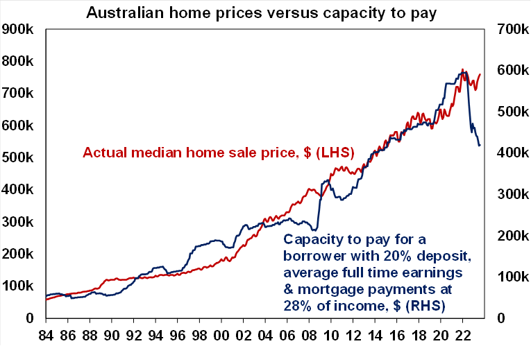 - There has been a big hit to home buyer “capacity to pay” from higher rates – we estimate that the capacity to pay for a home for a borrower with a 20% deposit on full time average earnings is around 29% lower than it was in April last year. The long term down trend in mortgage rates since 1990 was a major enabler of higher home prices relative to incomes over the last three decades, as lower rates boosted home buyers’ capacity to pay for homes for given income levels (see the next chart). The rapid reversal in the capacity to pay since May last year due to the surge in mortgage rates threatens a downwards adjustment in home prices at some point unless incomes rise dramatically or mortgage rates fall dramatically – both of which look unlikely for now. This adjustment in prices could come once less interest sensitive housing demand is exhausted.