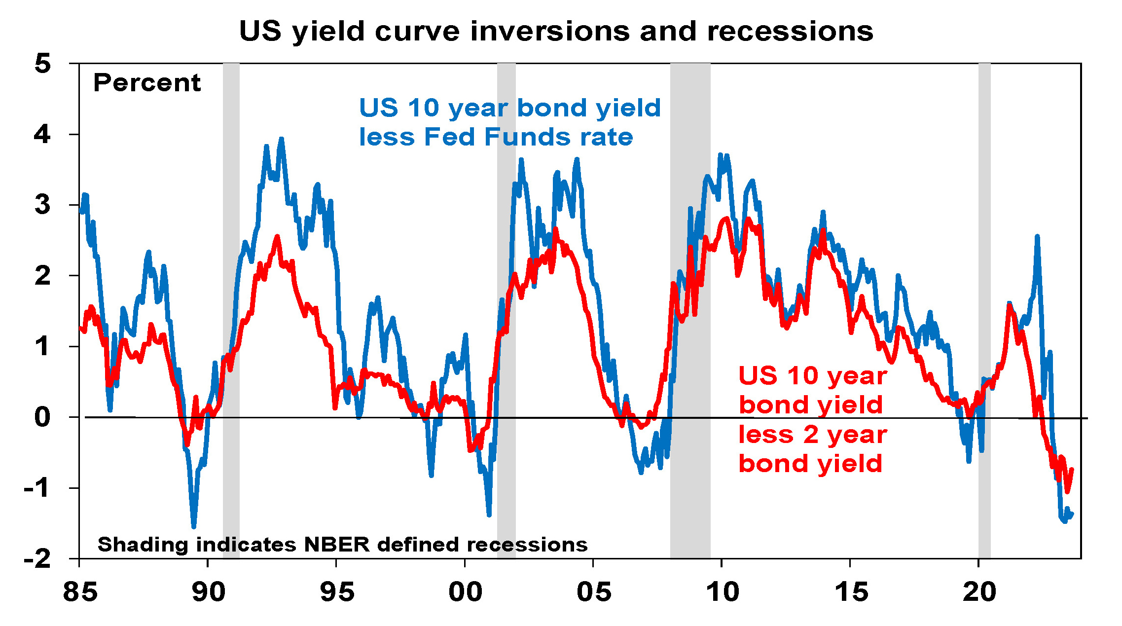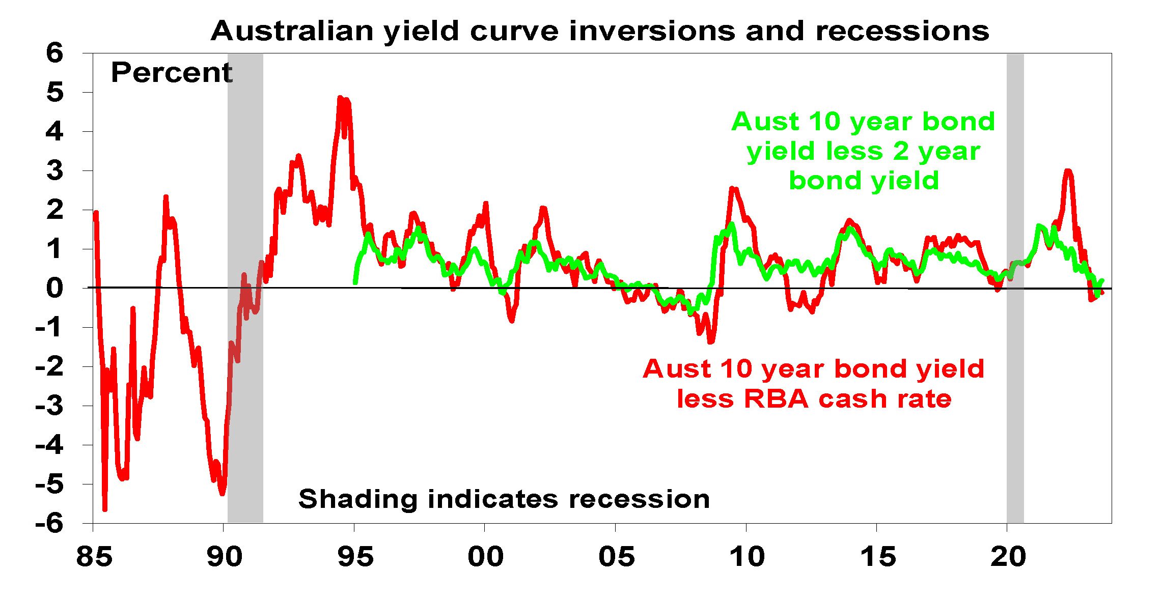 - The lag from yield curve inversion in the US can be 18 months. Various versions of it first inverted between July last year and January this year. So given normal lags it may not eventuate until next year.