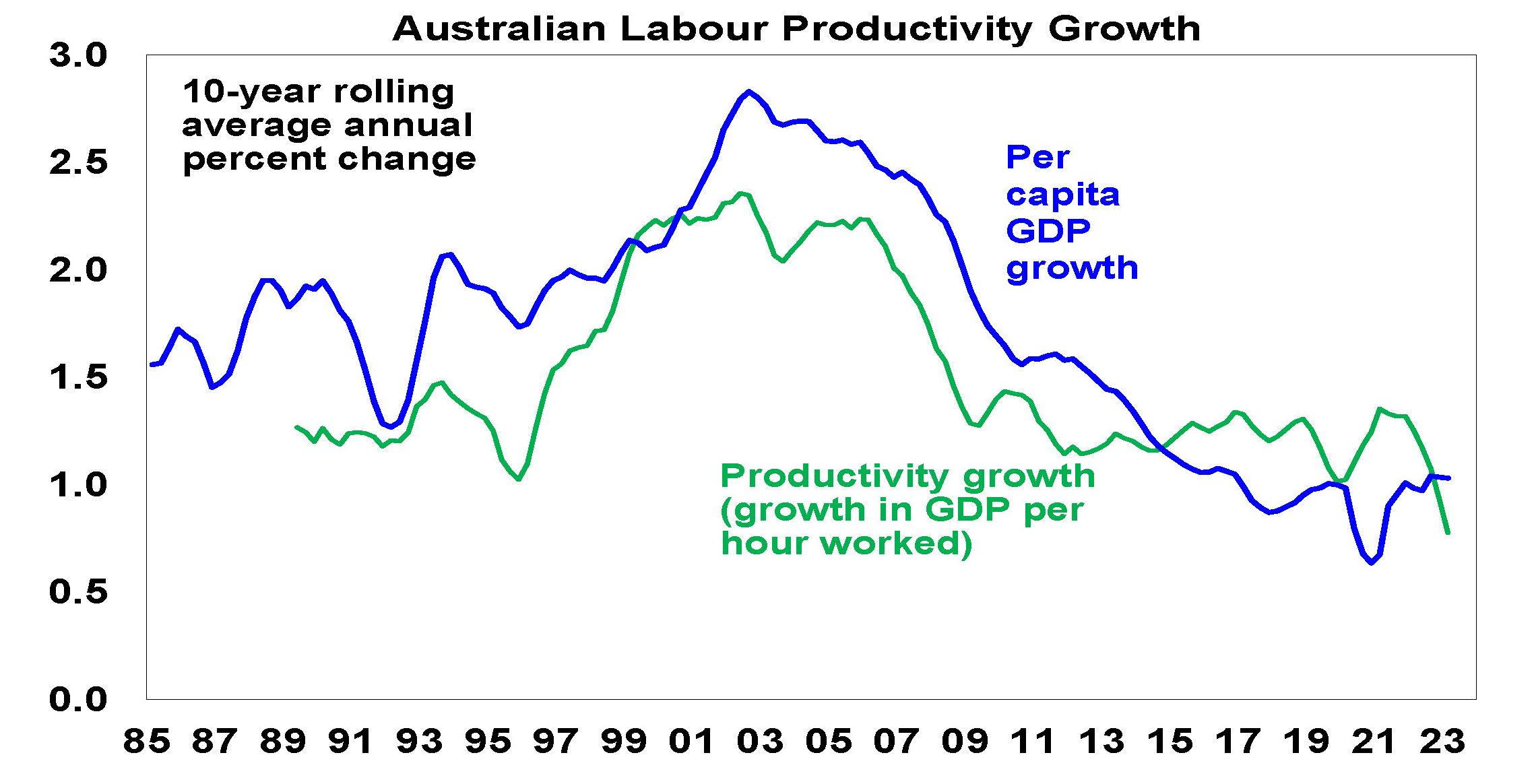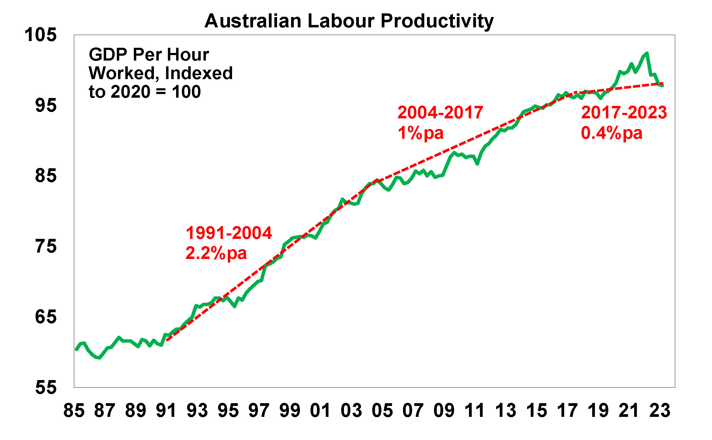 Why is it relevant for sustained decent wages growth?If wages growth is 4% and output per worker goes up by 1.5% then the increase in labour costs for business is 2.5% which if passed on as higher prices is in line with the RBA’s 2-3% inflation objective. But if wages go up 4% and productivity growth is zero, business costs go up 4% and they will pass this on to their customers likely resulting in inflation above the RBA’s target. Hence 4% wages growth is consistent with the inflation target but only if productivity growth picks up to its long-term average of 1.5% pa.