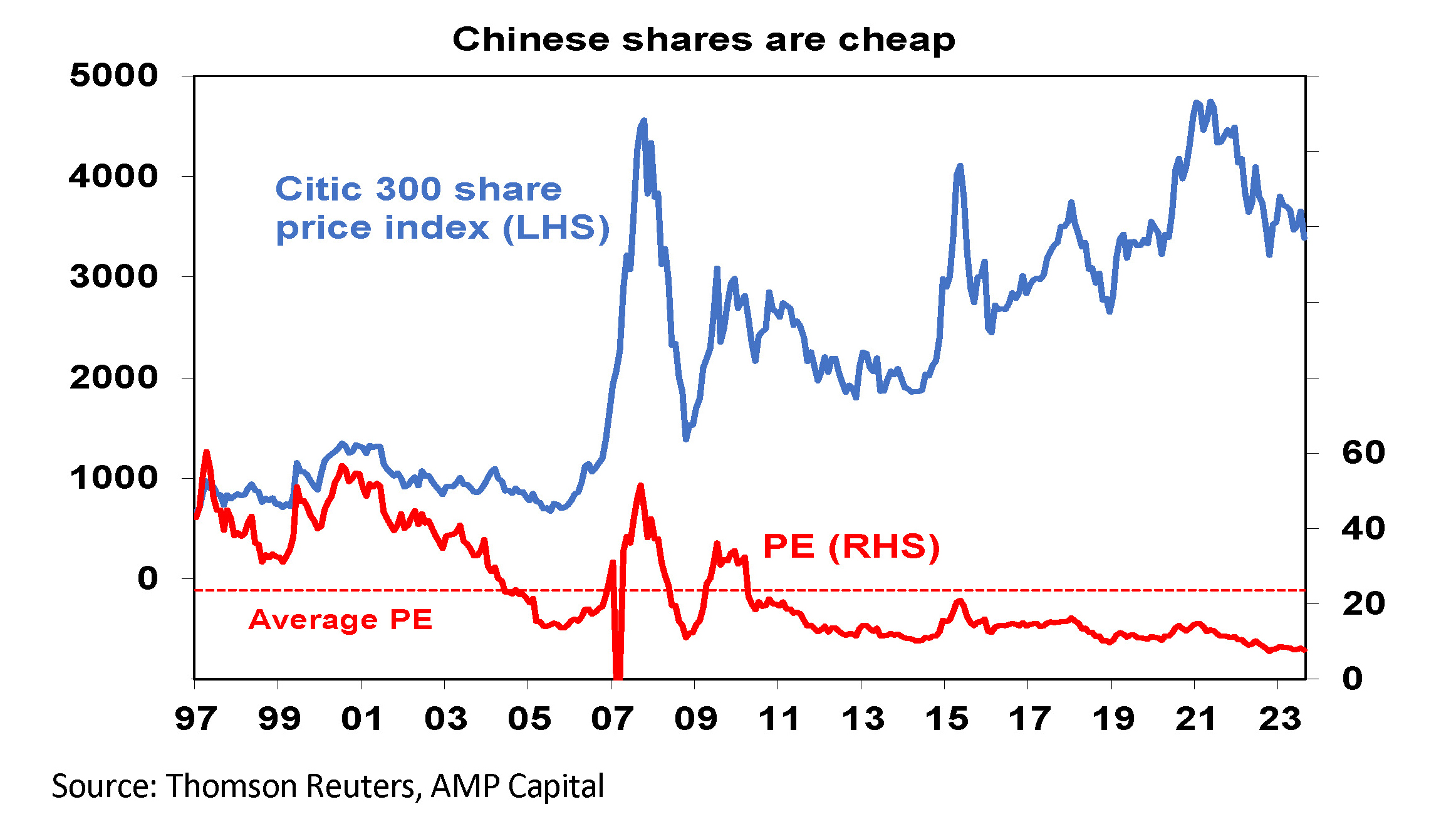 The Chinese Share marketChinese shares are down 36% from their record 2021 high and are cheap when compared to earnings (trading on a PE of just 7.7 times), book value and sales. This suggests significant potential for a bounce if significant stimulus is announced. However, the risks are on the downside.