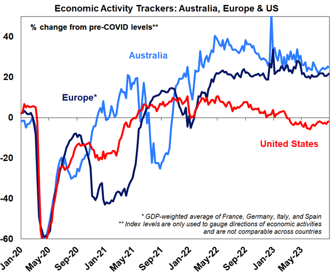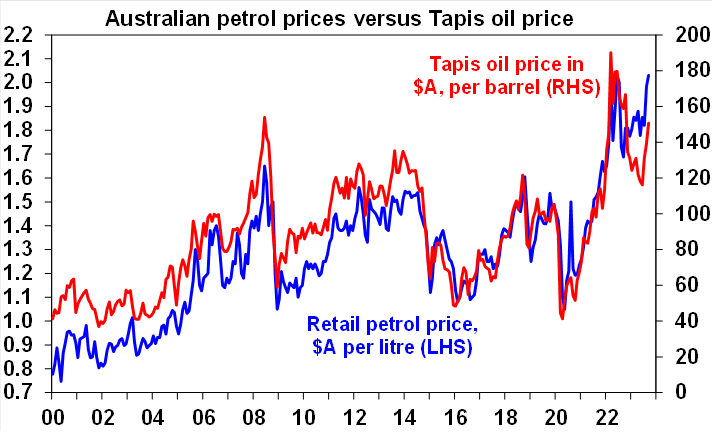 Australian petrol prices back around record levels above $2/litre. The rebound has been due to the rise in world oil prices (with Saudi and Russian production cuts) and the fall in the $A (see the red line in the next chart) and a widening in refinery margins (as evident in the gap between the blue and red lines). If petrol prices stay at current levels, they will be up roughly 5.5% this quarter which will add around 0.2% to September quarter CPI inflation. Fortunately, underlying inflation pressures are now more subdued than they were when petrol prices rose more than 40% over the year to June last year with now slowing economic growth as the reopening boost has run its course and higher interest rates are impacting and much improved goods supply so underlying inflation is less likely to be impacted. But the surge in petrol prices will hurt already struggling households and act as a tax on spending, but at the same time risk upwards pressure on inflation expectations which could add to the risk of another RBA rate hike.