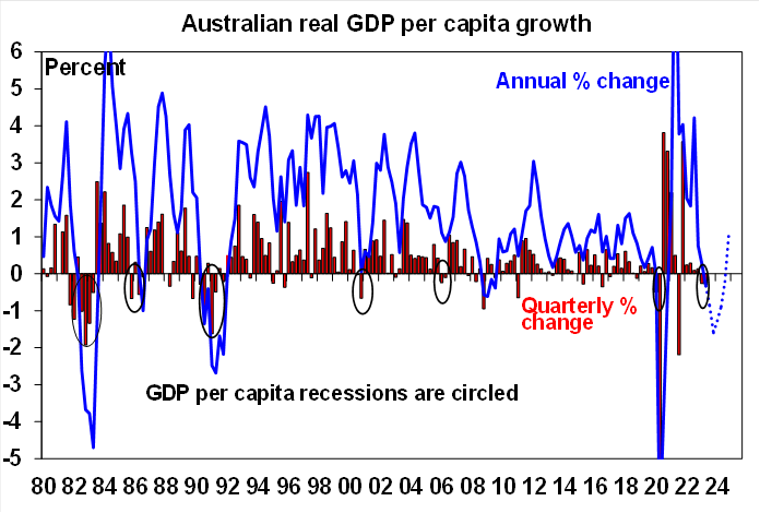 - We are now in a “per capita recession” with GDP per person falling for the second quarter in a row. This explains why people might feel that they are going backwards. In other words, the downturn has been masked by the surge in population growth which the ABS estimates to be running at 2.4%yoy.